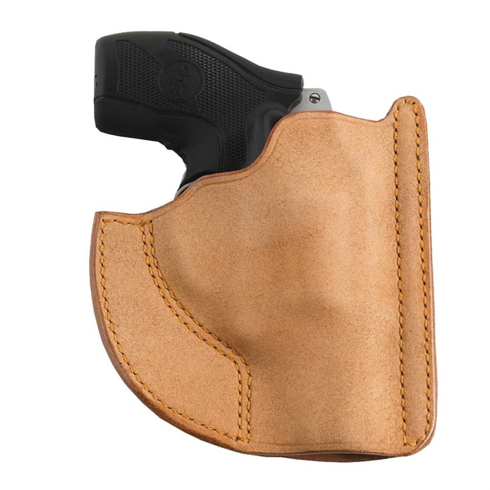 With practice (using an unloaded firearm), you can draw the firearm while the holster remains in your pocket or falls away (in the proper pants). It's made with smooth leather inside against the gun for easy release and the rough side out against the pocket, ensuring retention of the holster in the pocket. The holster should always be removed from the pocket when holstering the handgun.