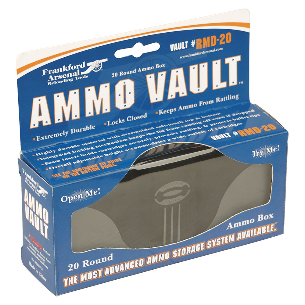 661120126003 The Frankford Arsenal® Ammo Vault® takes ammo storage and transportation to a whole new level. By combining tough, impact-resistant materials and an innovative locking design the Ammo Vault® offers unsurpassed protection for your rifle cartridges. No more rattling, no more rubber bands, no more cracked and broken boxes. Give your ammunition the protection it deserves. RMD-20 fits ammo from 222 Rem to 30-06.Discontinued by manufacturer