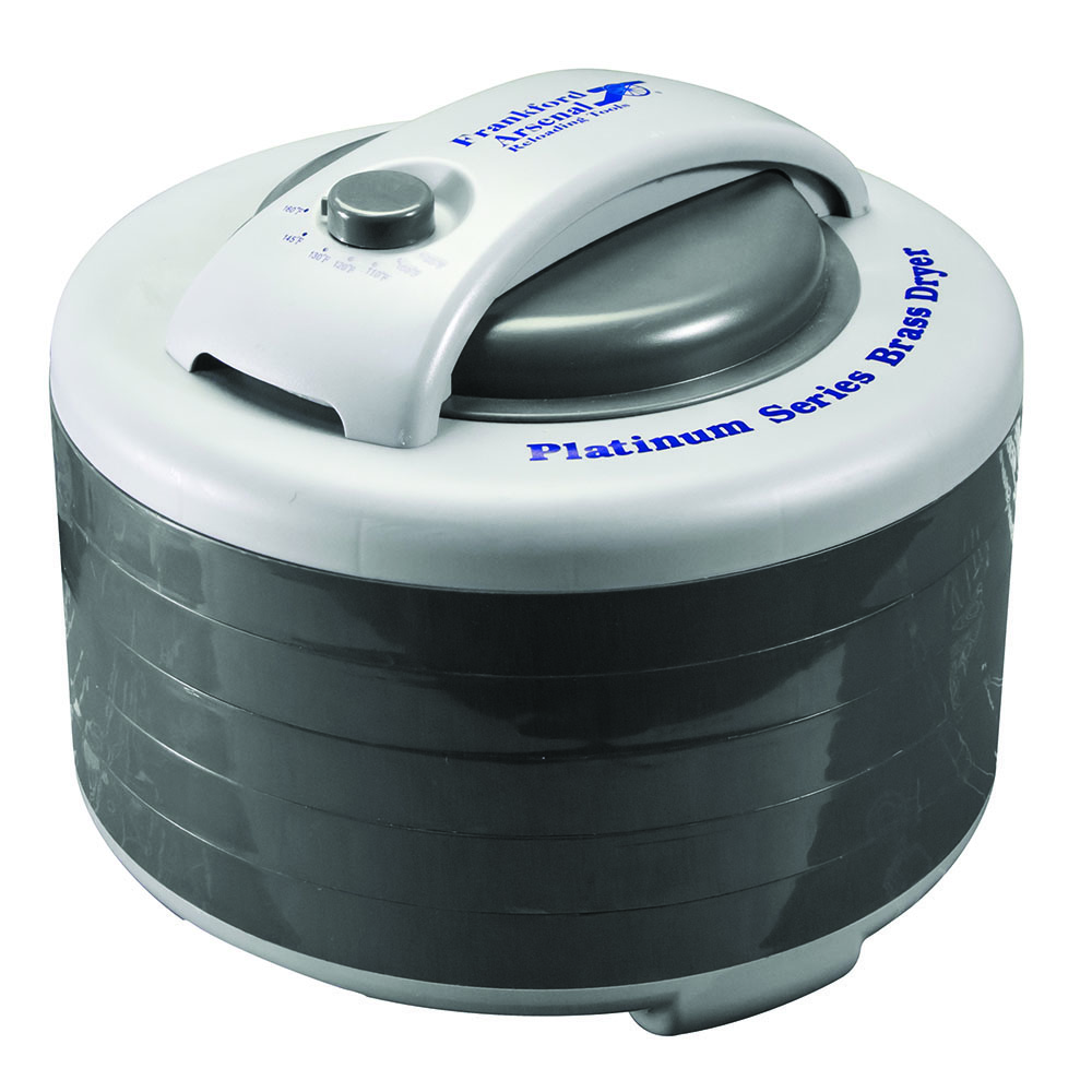 661120001355 The Frankford Arsenal® Platinum Series Brass Dryer is a quick, convenient, and efficient system for drying your brass. This dryer is the perfect tool for drying your rifle and pistol brass after wet case cleaning processes such as rotary tumbling or ultrasonic cleaning. The separate and removable trays let you dry different calibers at the same time without mixing them together. The Brass Dryer is a high-capacity unit that can dry up to 1000 pieces of .223 rifle brass or up to 2000 pieces of 9mm pistol brass. This dryer can dry your brass cases inside and out in under an hour. The forced air convection heating lessens the chance of watermarks on your newly clean brass. The powerful 500 watt heating system heats air quickly and consistently, which reduces drying time. The forced air flow design ensures that heat and air are evenly distributed throughout the separate trays, drying the cases inside and out. The top mounted fan ensures that no moisture from the cleaning process can accumulate in the circuitry. The drying trays have fine grated bottoms and retaining ribs to keep your brass separated on different layers. Combined with a Platinum Series Rotary Tumbler, dirty corroded range brass will be as shiny as new.Delivery time approx. 6-10 days.