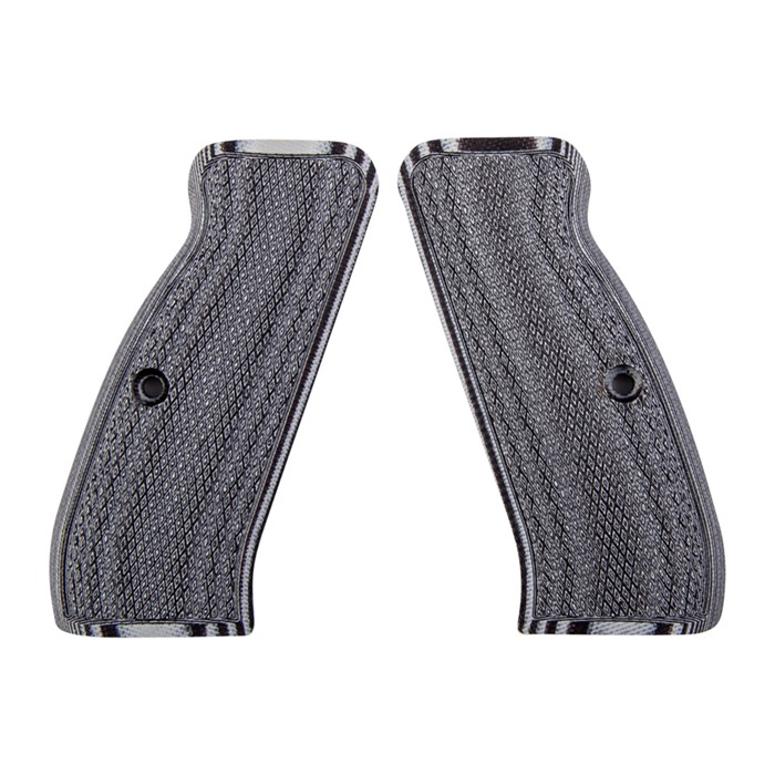 - These grips feature a checkered pattern in a gray and black color blend, designed to improve the shooter's grip on the handgun.