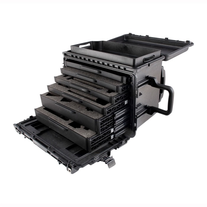 050806011618 The Brownells Armorer’s Tool Chest from Pelican has been updated to be even tougher and more user friendly. The new chest now features an aluminum rail slide system, each tray slides out into a secure position for easy access of your tools and can be effortlessly removed for repositioning or cleaning. Made from nearly indestructible molded polymer resin and meets mil-spec MIL-STD810F. Pre-cut foam inserts are included to fit all the tools that are included int the standard and premium armorer’s kits. Generation 2 Extended length trolley handle Removable drawers Aluminum rail slide system Two-way handles Heavy duty buttress hinges Stable, wide track mobility Metal butterfly compression latches Field replaceable wheels Auto pressure equalization valves Tools not includedDelivery time approx. 7-14 days.