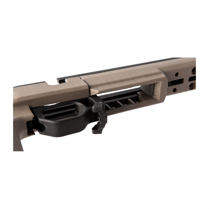 The Kinetic Research Group Howa 1500 Bravo Chassis is designed with a backbone made from machined aluminum that extends along the entire length of the stock, providing rigidity that ensures performance comparable to custom bedding jobs. The remainder of the stock is constructed from reinforced polymer for enhanced durability.