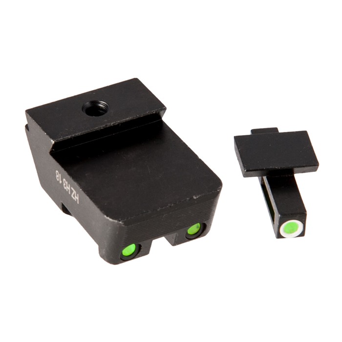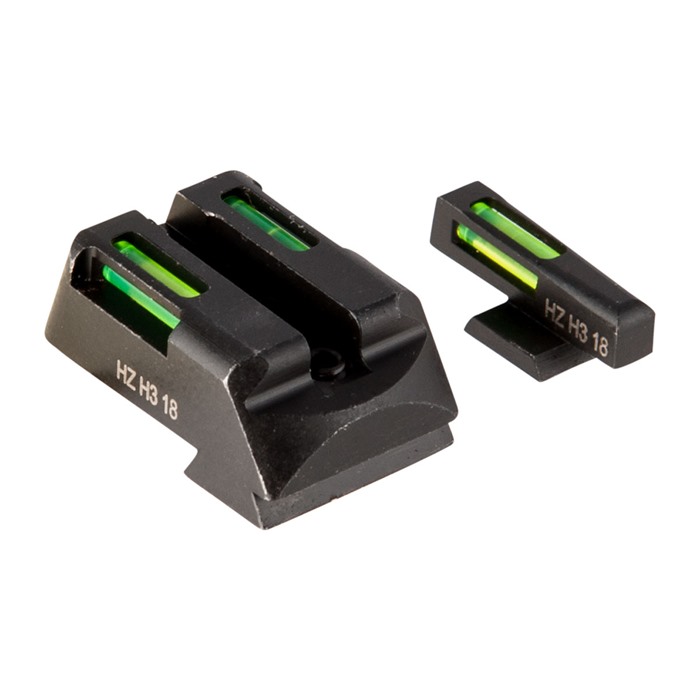 The HIVIZ LiteWave H3™ Green sights are sold as front/rear sight sets and are engineered for a drop-in fit to your pistol's factory slide dovetails (screw holes, in the case of Glocks). Sight bodies are made entirely of steel to ensure thorough protection of the Tritium and fiber optic inserts. Sights are sized for proper clearance in standard holsters for your pistol.