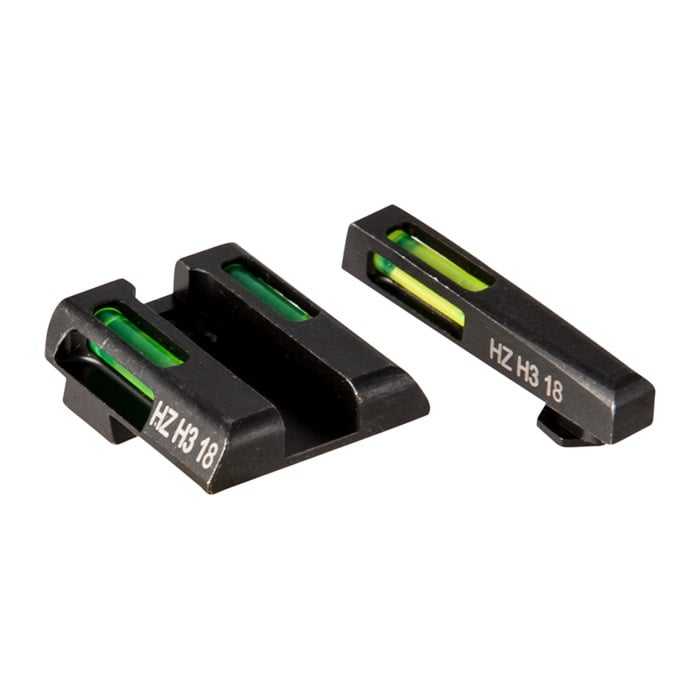 The HIVIZ LiteWave H3™ Green sights are sold as front/rear sight sets and are engineered for a drop-in fit to your pistol's factory slide dovetails (screw holes, in the case of Glocks). Sight bodies are made entirely of steel to ensure thorough protection of the Tritium and fiber optic inserts. Sights are sized for proper clearance in standard holsters for your pistol.