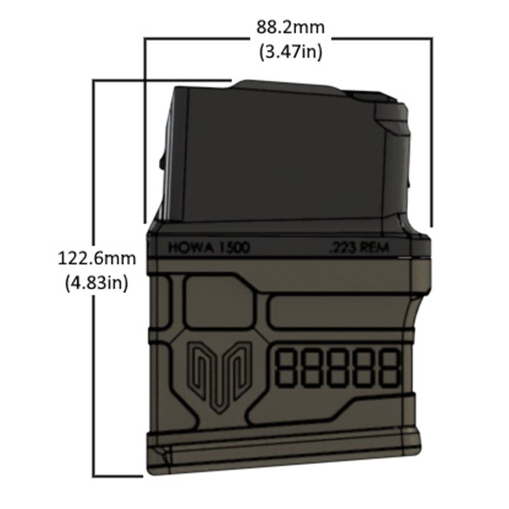 This magazine is compatible with the Howa 1500 and Howa mini 10, accommodating cartridges such as .223 Remington, 7.62x39, .300Blk (mini), .308 Winchester, .243 Win, and 6.5 Creedmoor when paired with Mamba bottom metal.