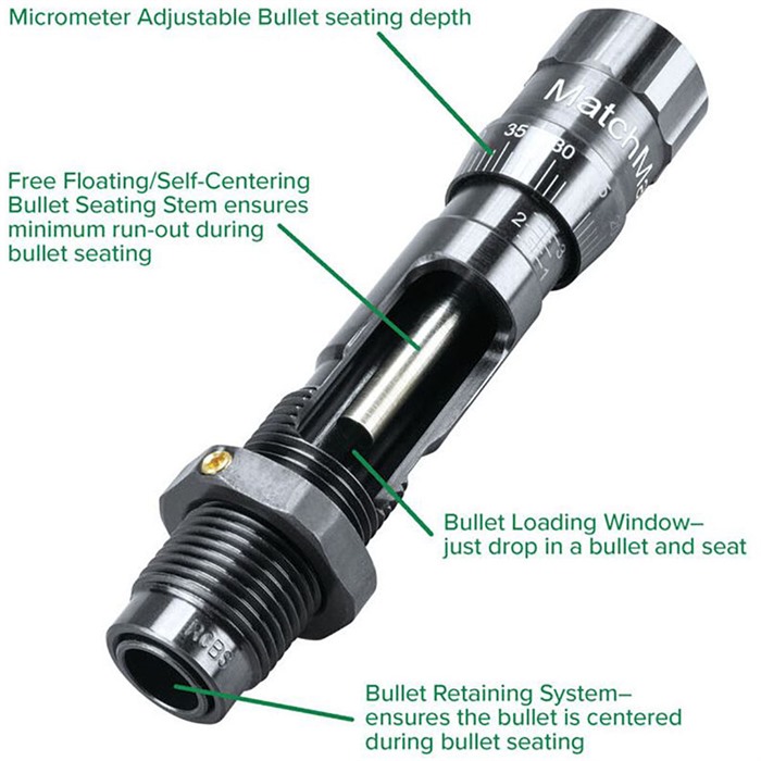 850070830485 RCBS MATCHMASTER BULLET SEATER DIES Matchmaster dies are the pinnacle of reloading dies with rich features, outstanding fit and finish, and unbeatable accuracy. Available in both full-length size and neck-size sets, as well as a stand-alone seater die, you will enjoy years of use from Matchmaster dies. Each die is made from case hardened steel, the inside surfaces are precision-drilled and reamed to exacting standards, and hand polished. The Matchmaster seater die is beautifully machined, polished, and finished off with a deep blued finish like on the finest firearms. The large, oversized adjustment knob on the Matchmaster seater die has oversized letters and hash marks making it both precise to turn as well as easy to read. Dial one thousandth of an inch, and that is exactly what you will get. The seater also features RCBS exclusive loading window which allows you to drop the bullet in and simply run the press to seat your bullet. No more trying to balance a bullet on a case mouth or putting fingers in danger. The internal sleeve catches and holds the bullet in perfect alignment with the case and guides it during the seating operation for astoundingly concentric results. FEATURES Bullet Seating Die Only Bullet seating window with bullet retention system Large Oversize Micrometer for easy adjustments free-floating, self-centering bullet seating stem Standard 7/8"-14 Thread Limited Lifetime Warranty Made in USADelivery time approx. 7-14 days.
