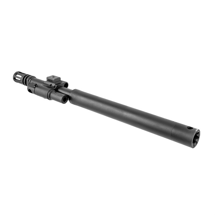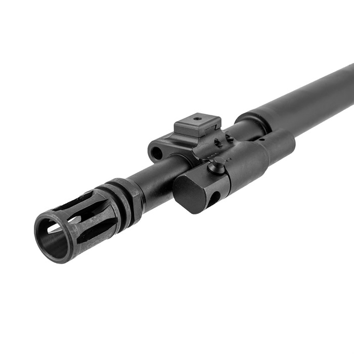 - The barrel has a black finish, includes an A2 flash hider, and has 1/2-28 muzzle threads for accessories.