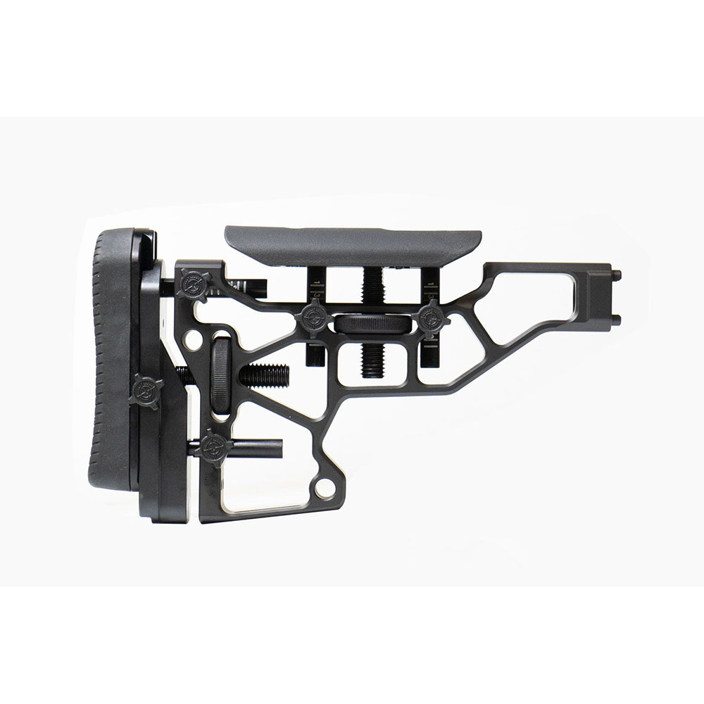 - The MDT Skeleton Rifle Stock features toolless adjustments for cheek riser and buttpad, providing a custom fit for the shooter's comfort and performance.
