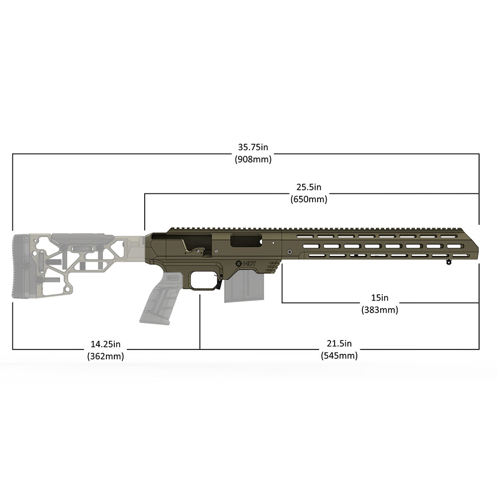 To complete your chassis system, we recommend purchasing the MDT AR Pistol Grip and Skeleton Rifle Stock, along with at least one magazine suitable for your action and caliber. Experience less felt recoil, quicker follow-up shots, and improved accuracy with the MDT TAC21 Gen 2 Chassis System.