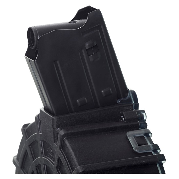 - Hybrid design magazine body constructed of heat treated carbon steel upper feed tower and injection molded polymer drum housing
