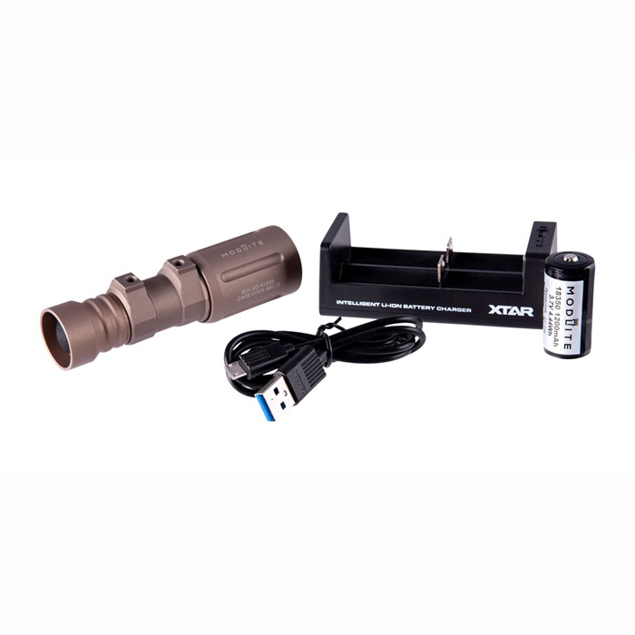 - The Modlite PLHv2 18350 weapon light package includes a light head, body, optional tail cap, a KeepPower 1200mAh battery, and a XTAR MC2 charger.