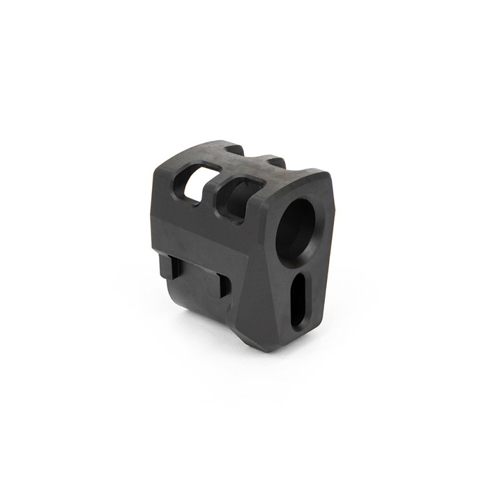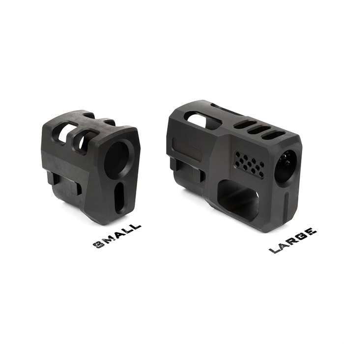The Comp for Strike Modular Chassis (SMC) is specifically designed for use with the Standard length Strike Modular Chassis (SMC) - ALPHA setup, utilizing a SIG SAUER P320 3.9” slide/barrel. This seamless design allows for a direct mount to the chassis compensator, available in two length options: small and large.