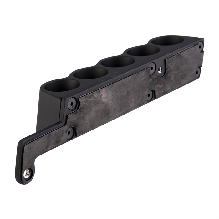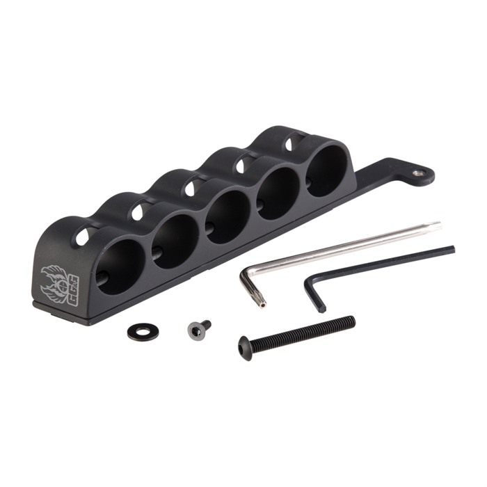 1. The GG&G Side-Saddle Shell Holder for the Mossberg Shockwave allows for quick access to ammunition, holding 5 rounds at a 15° angle for faster loading.
