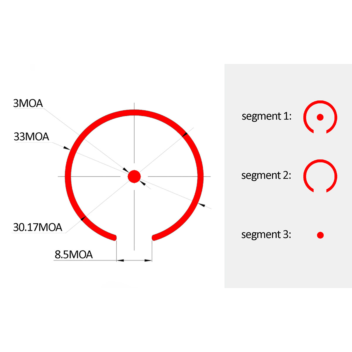 - Selectable 3 segment reticle (3 MOA dot, 33 MOA bullseye, and 33 MOA ring) allows you to tailor how you interact with your optic.