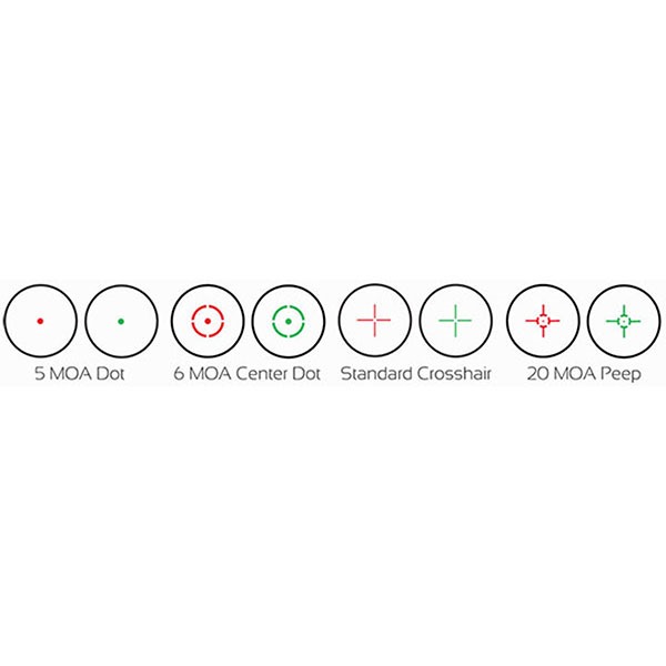 - Multi-Reticle/Dual Color (MR/DC) model with four reticle settings: 10 MOA dot, 15 MOA peep, 3 MOA center dot, and standard crosshair.