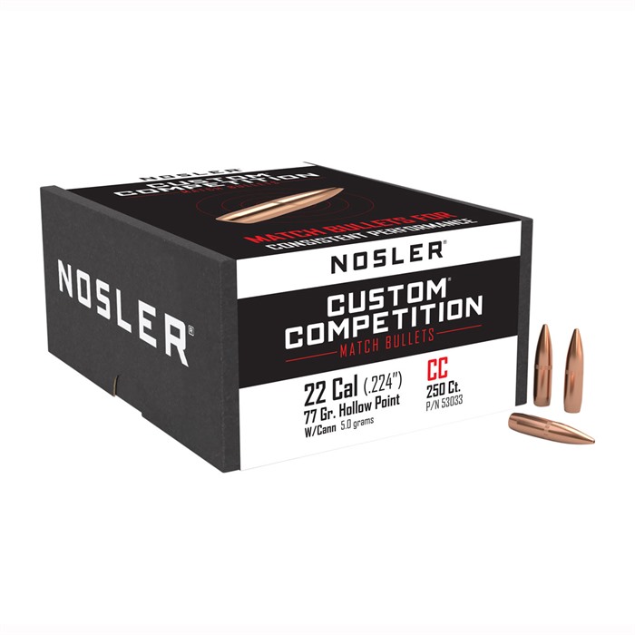 - Nosler's Custom Competition 22 caliber bullets are designed for high performance and accuracy, featuring the same bullet jackets used in custom bullets and precise lead alloy cores.