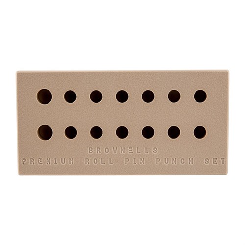 This Delrin bench block is designed specifically for your roll pin sets, featuring 14 precisely bored holes to accommodate both the Brownells premium starter and standard roll pin sets.