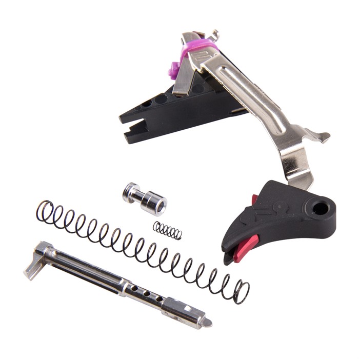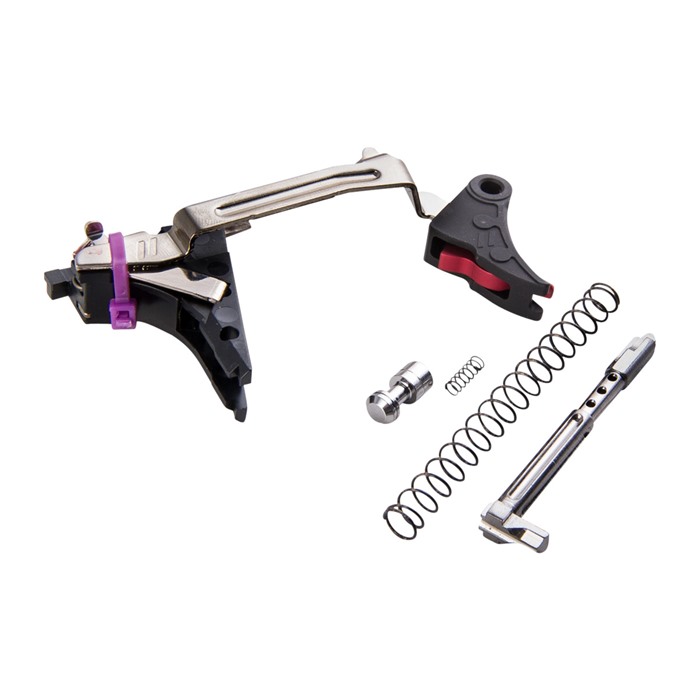 - The kit includes a variety of components such as a trigger, firing pin, and springs to enhance the trigger pull and reset speed.