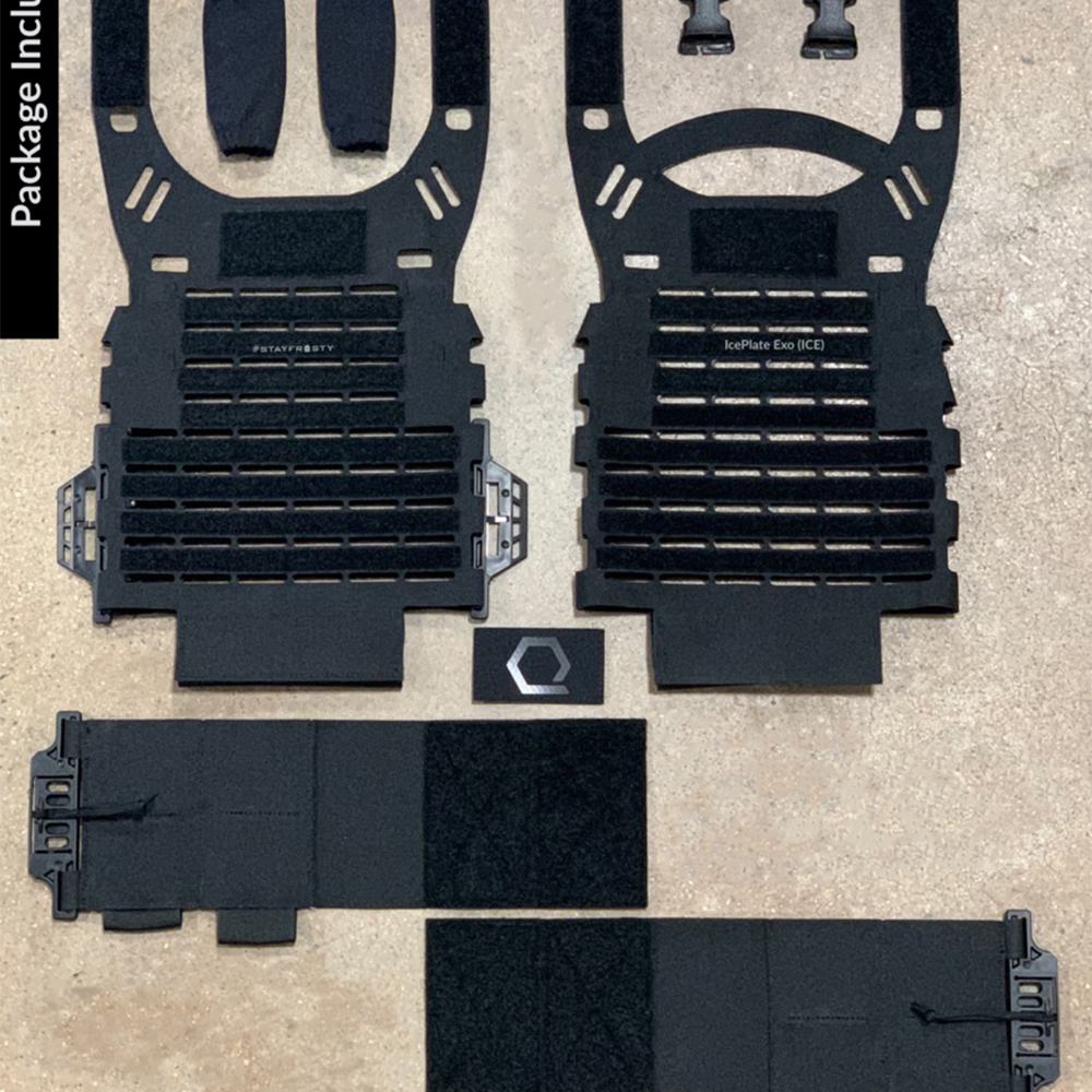 IcePlate EXO (ICE) is a new type of ultra-minimalist, ventilated, multi-role, scalable plate carrier. IcePlate EXO (ICE) anchors our IceAge Ecosystem by combining all of our human performance enhancement and environmental inoculation technologies into an ultra-light, durable, and breathable platform with unrivaled capabilities. IcePlate EXO (ICE) weighs so little yet withstands so much. It furthers our mission of providing American Warfighters, Law Enforcement Officers, Private Security Contractors, and responsible citizens the means of consistently achieving Individual Operator Overmatch -- When Close Counts. Each Package Includes:1x ICE Front Sleeve1x ICE Rear Sleeve1x ICE Elastic Cummerbund w/2x 5.56 Mag Pockets per side2x ICE Shoulder Shrouds2x IcePlate PVC Pull Tabs2x Swift Clips1x Laser Cut Q-Hex IR Patch (colors may vary) Specs: Light + Strong Using a unique and incredibly strong laser-cut, high molecular weight polyethylene laminate that is 14 times stronger than steel, ICE weighs just 19 ounces. This makes it one of the lightest plate carriers available today. It is also hydrophobic, cut-resistant and abrasion resistant. MAPs-based Modularity With MAPs (MOLLE Attachment Points) and loop on both the inside and the outside of each sleeve as well as an open-bottom architecture (also accommodates Left Exit and Right Exit IcePlate Curve), ICE is configured for maximum ventilation, modularity and drainage. ICE will not retain water, even under the most intense circumstances. Medium ESAPI Plate Compatible ICE fits Medium ESAPI plates. This design synchronizes with IcePlate Curve to create the thinnest, flattest, toughest and coldest (or hottest) system ever. Evaporative cooling is facilitated by the laser-cut MAPs on the inside of the plate bag, but can also supercharged easily with IceVents. Unparalleled Customization IcePlate Sleeve (coming soon) can be stacked (via MOLLE and/or hook and loop) for streamlined carry of both/either/or ESAPI armor plates and IcePlate Curve. Individual IcePlate Sleeves can also be purchased to MOLLE onto any plate carrier on the market. Don/doff is easy with a flat and durable quick-release system. ICE also features an elastic cummerbund with four pouches for 30-round magazines, SOARescue MedMags, radios, etc. The ICE MOLLE Cummerbund will be backwards compatible with all ICE units. Weight: Ultralight at just 19 ouncesDiscontinued