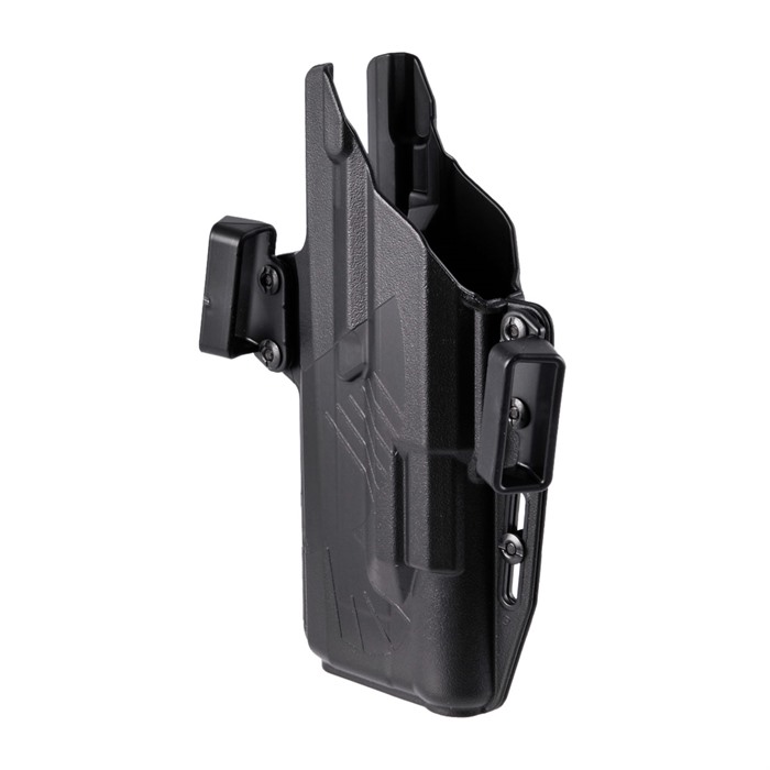 The holster features rounded edges for comfort and an opening designed to allow foreign objects to drop out, preventing blockages during re-holstering. The ambidextrous design includes full-height body shields that protect your pistol from sweat and prevent cover garments from interfering during use.