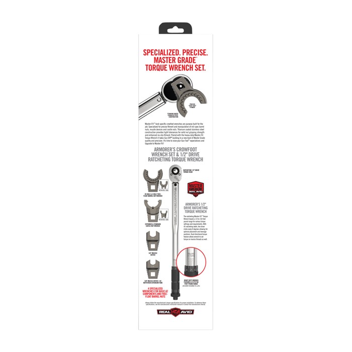 - 5-Piece Master Grade A2/AR-15 Wrenches & Torque Wrench: This set includes four specialized crowfoot builder wrenches, each crafted from titanium-coated stainless steel, tailored to fit the most common A2/AR-15 assembly nut sizes. Accompanied by a heavy-duty ½” torque wrench, this combination ensures precise torque application, preventing over-tightening and potential damage to components. The set comprises: