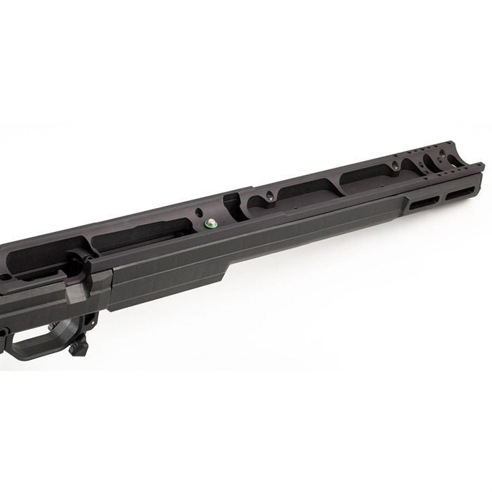 - Designed for the Remington 700 with a long action type, the chassis features aluminum block bedding but is not compatible with actions that have trigger hangers unless modified.