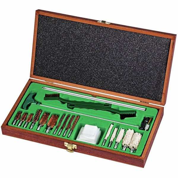 This comprehensive kit is designed for the dedicated shooter, featuring a sturdy wooden presentation box that houses a 27-piece cleaning set along with 50 cleaning patches.