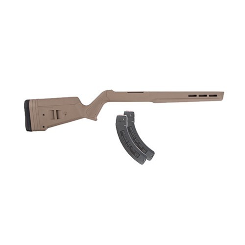 - Magpul's Hunter X-22 stock for the Ruger® 10/22® is made from reinforced polymer, offering strength and durability, with an adjustable length of pull and optional cheek risers for a customizable fit.