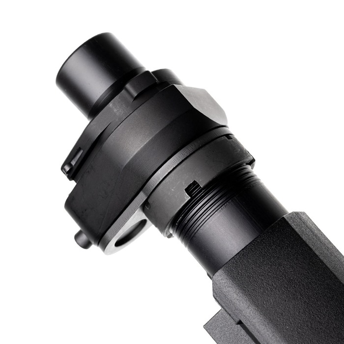 To detach the buttstock, simply push the button and twist counter-clockwise 30 degrees. The buttstock will be separated from the firearm. To re-attach, align the two pieces, push in and turn clockwise 30 degrees. The steel locking mechanism will automatically secure the adapter.