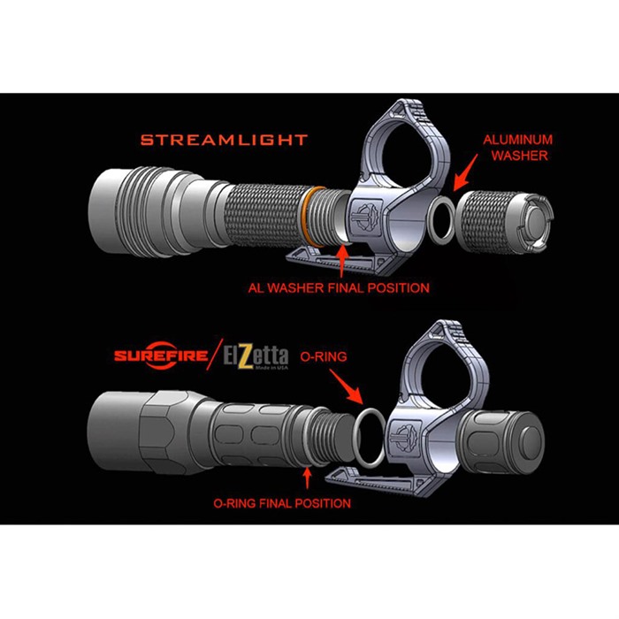 752785882189 SWITCHBACK 2.0 LARGE FLASHLIGHT RING WITH POCKET CLIP The SwitchBack® 2.0 adds a multi-function finger ring and robust pocket clip to your tactical flashlight. It mounts securely between the light’s tailcap and body, providing a repeatable grip index during deployment from pocket or pouch, and enhances ergonomics while shooting or searching. The SwitchBack® 2.0 is the next evolution in the innovative SwitchBack Flashlight Ring product line. It incorporates new features and refinements based on thousands of hours of use by our subject matter experts and customers. The SwitchBack mounts between the tailcap and body of your flashlight, making it secure regardless of impact, moisture, and heat/cold changes. FEATURES: SwitchBacks can be used with handguns or long guns. It allows the user to: Reliably deploy and index a flashlight from both pockets and pouches, using the SwitchBack’s rigid, but releasable, retention ring. Shoot using a natural two-handed grip (the SwitchBack Technique). Employ all traditional low-light techniques such as Neck Index, Modified FBI, and Harries. Positively retain the light when drawing a firearm, reloading, and addressing a malfunction. The SwitchBack provides fast deployment and enhanced retention during many activities such as climbing, backpacking, car and home maintenance, and self-defense. New for SwitchBack 2.0: A finger ring that releases under heavy force/torque but can be reset. A stronger pocket clip that also works with MOLLE/PALS webbing. A pocket clip position that allows for slightly deeper carry than the SwitchBack® Large (original). A tubular portion that is cut lower to allow grip on both sides of the tail-cap during installation. A wider thumb rest with traction features. Small crush ribs on the SwitchBack 2.0’s lip that create a custom fit across a broader range of lights. An aluminum spacer that expands compatibility to Streamlight HL and HL-X flashlights and other manufacturers with similar designs. Installation For installation, first try installing the SwitchBack on your light without use of the O-ring or aluminum washer. Simply unscrew the tailcap, add the SwitchBack, and rescrew the tailcap back on. If the light does not activate upon use of the tailcap switch with the SwitchBack installed, try installing the aluminum washer as shown in the diagram below. Streamlight models tend to require the aluminum washer, but may not, depending on the tailcap features of the light. Elzetta and Surefire models do not usually require the aluminum washer, but users may find that addition of the rubber O-ring will help to stabilize the position of the SwitchBackDelivery time approx. 7-14 days.