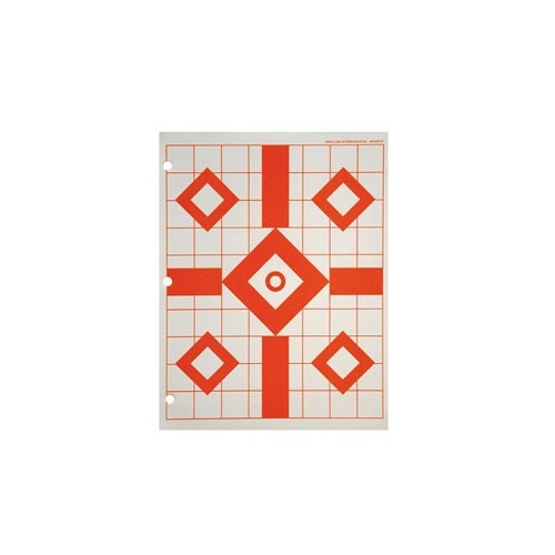 Our sight-in target is comprised of 4 small diamonds surrounding a large center diamond overlaid on a grid of 1 inch squares. Diamonds and grid are printed in fluorescent orange on white, heavy grade paper stock so your shots print nice and clean. Excellent for low-light conditions. Targets measure 8-1/2 x 11 inch and are sold in pads of 25.Delivery time approx. 7-14 days.