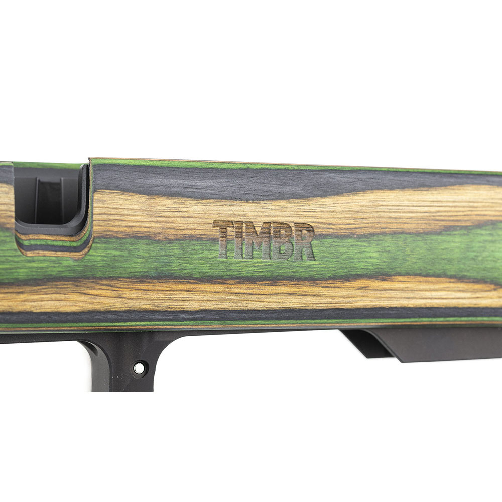 The MDT Timbr Frontier has been developed to provide the look and feel of a traditional stock while incorporating the precision and repeatability of the modern V-Block bedding from a chassis. The buttstock and forend are made of Birch hardwood laminate, giving every stock a unique wood grain and warm feel. They are then finished with a high-quality clearcoat and attached to the aluminum micro chassis and bottom metal.