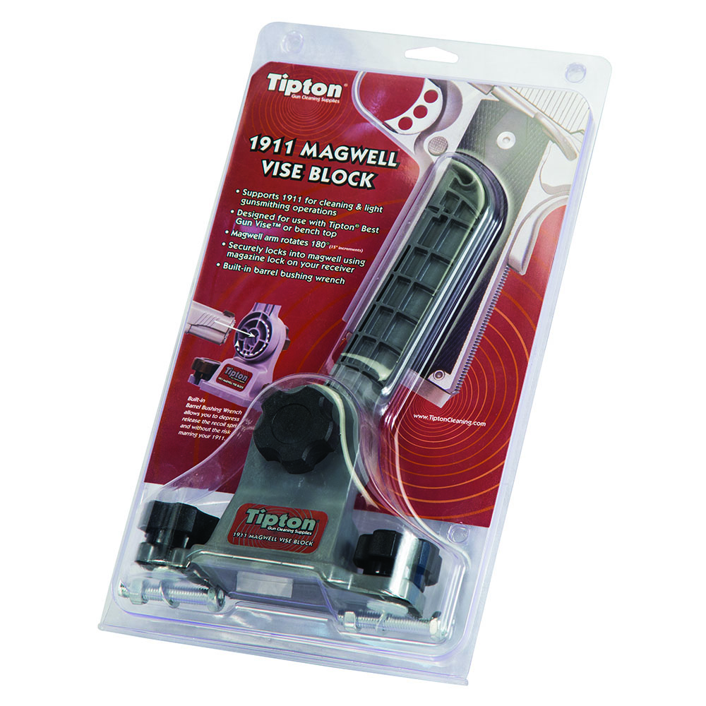 661120580805 The Tipton® 1911 Mag Well Vise Block is quite possibly the handiest tool a 1911 owner could ask for. Designed for use with the Tipton® Best Gun Vise™, this center support slides into the magazine well and provides a steady base for cleaning or light gunsmithing on your 1911. Users without a Best Gun Vise can mount the Mag Well Vise Block directly to their bench top with the included fasteners. Loaded with handy features, this tool is a must have for anyone with a 1911.Delivery time approx. 6-10 days.