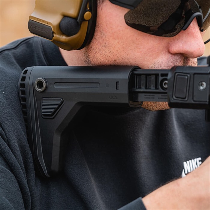 MAGPUL® UCS™ ADJUSTABLE CARBINE STOCK FOR AR-15   The Magpul UCS (Universal Carbine Stock) is designed to be the ideal supplement to the vast array of firearms utilizing a vertical M1913 Picatinny rail on the rear of the receiver for stock fitment. To accommodate the wide variety of charging handles styles, ejection port locations, and control locations, the UCS features a reversible hinge for left and right folding configurations, and five degrees of drop for clearance.   The UCS ships with two reversible Cheek Risers (0.50", and 0.75"), and when combined with the reversible M1913 clamp (allowing for a 1/2-slot height adjustment), the shooter can dial in head placement for an optimal sight picture using iron sights or optics.   Offering three (3) inches of length of pull (LOP) adjustment spanning six (6) positions – which can be adjusted via the LOP buttons – the stock fits any shooter, with and without armor or other bulky equipment. The UCS also includes a reversible, anti-rotation QD socket for sling attachments, and is compatible with MOE SL® and DT Butt-Pads.   Made in the USA.   FEATURES   PROVIDES EXTREME ADJUSTABILITY Six (6) position, push-button LOP adjustment allows three (3) inches of total adjustment Toolless, removeable and reversible Cheek Risers for comb height adjustment (0.50" and 0.75") Reversible M1913 clamp allowing for a ½-slot height adjustment for further stock height adjustment ADAPTABLE TO MULTIPLE PLATFORMS Compatible with all firearms with an M1913 rail on the rear of the firearm’s receiver 5° drop angle for charging handle and ejection port clearance Reversible folding mechanism to modify folding direction SHOOTER CONFIGURABLE Reversible, anti-rotational QD socket for sling attachment Compatible with MOE SL and DT Butt-Pads Designed to fit shooters with or without bulky gear SPECS LOP Adjustment Range: 3 in. Length: 7.6 - 10.6 in. Length of Pull:Exact LOP range varies depending on platform* Height at Butt Plate: 5.3 in. Weight: 1.1 lbs Width, max:1.9 in. (at hinge) COMPATIBILITY Receivers equipped with an M1913 rail instead of a buffer tube from the factory, or receivers with an M1913 aftermarket adapter, including but not limited to the SIG MPX/MCX, FN SCAR, IWI Galil, CZ Scorpion, Ruger LC carbine, Brownell's BRN-180, and certain AK variants such as the PSA AK/AK-V. Exact LOP range varies, known Max/Min LOP follows: Sig MCX: 11.3 - 14.3 in. Sig MPX: 11.6 - 14.6 in. FN SCAR: 11.8 - 14.8 in. IWI Galil: 11.3 - 14.3 in. CZ Scorpion: 11.6 - 14.6 in. Ruger LC Carbine: 13.3 - 16.3 in. PSA AK: 11.7 - 14.7 in.