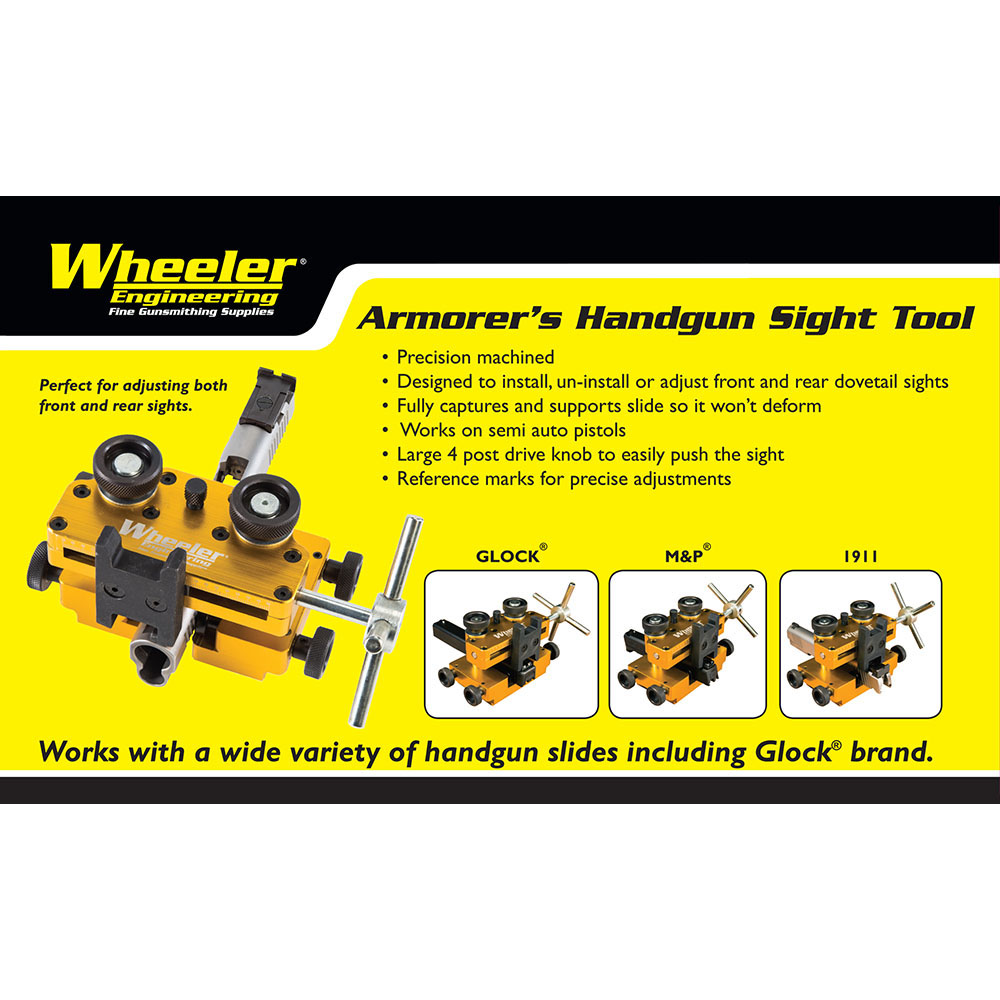 661120109051 The Wheeler® Armorer’s Handgun Sight Tool is designed for adjusting, installing or removing dovetail style front and rear handgun sights. Made of high end materials, the Wheeler® Armorer’s Handgun Sight Tool will last for years of hard use.Backordered, delivery from manufacturer overdue.