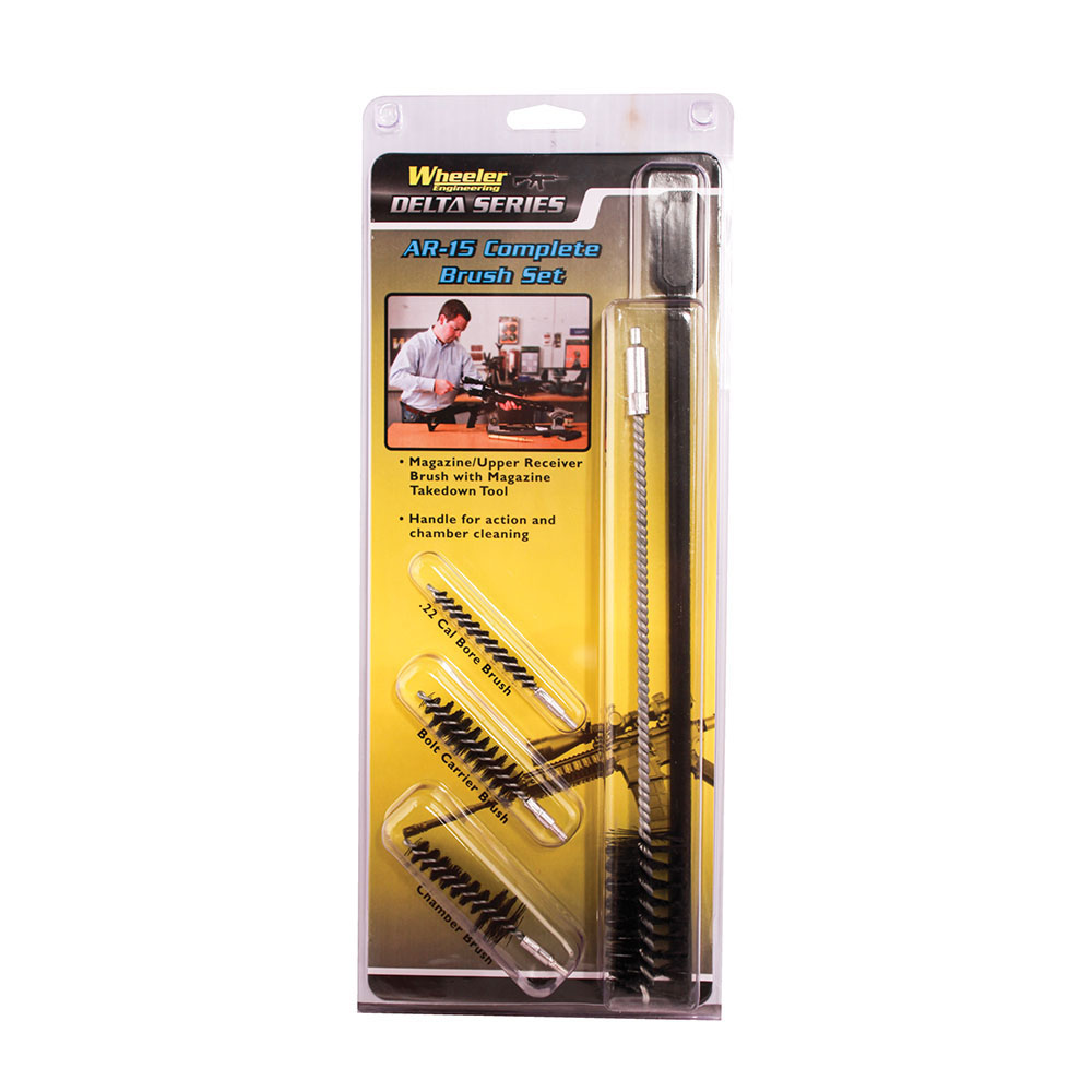 661120567158 The Wheeler Delta Series AR-15 Complete Brush Set is specifically designed for cleaning your AR-15. The brushes are made of a high quality stiff Nylon, spun around steel cores for added stability. The brushes feature an 8 x 32 thread that fit on the included cleaning handle or any 8 x 32 cleaning rod. The brush set has everything you need to clean your rifle, plus everything you need to keep your magazines clean and running reliably. The Brush Set Includes: Magazine/Upper Receiver Brush with Magazine Take down Tool Bolt Carrier Brush, Chamber Brush, .22 Cal Bore Brush, and Handle for action and chamber cleaning.Backordered, delivery from manufacturer overdue.