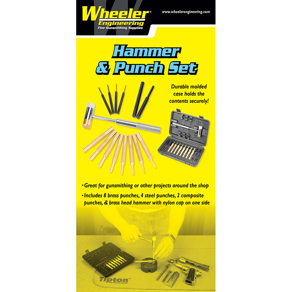 661120519003 The Wheeler® Hammer and Punch Set includes a polymer/brass combination hammer, eight precision brass punches, four steel punches and two plastic punches. It comes in a handy molded case. It makes for a great tool for driving pins or drifting sights at the shooting range, or on your gunsmithing bench. Kit Includes: Hammer with brass and polymer face 8 Brass punches: 1/8", 9/64", 5/32", 3/16", 7/32", 1/4", 9/32" and 5/16" 4 Steel punches: 2 each of 1/16" and 3/32" 2 Plastic punches: 15/64" and 3/8" Molded plastic storage case Rounded punch endsBackordered, delivery from manufacturer overdue.