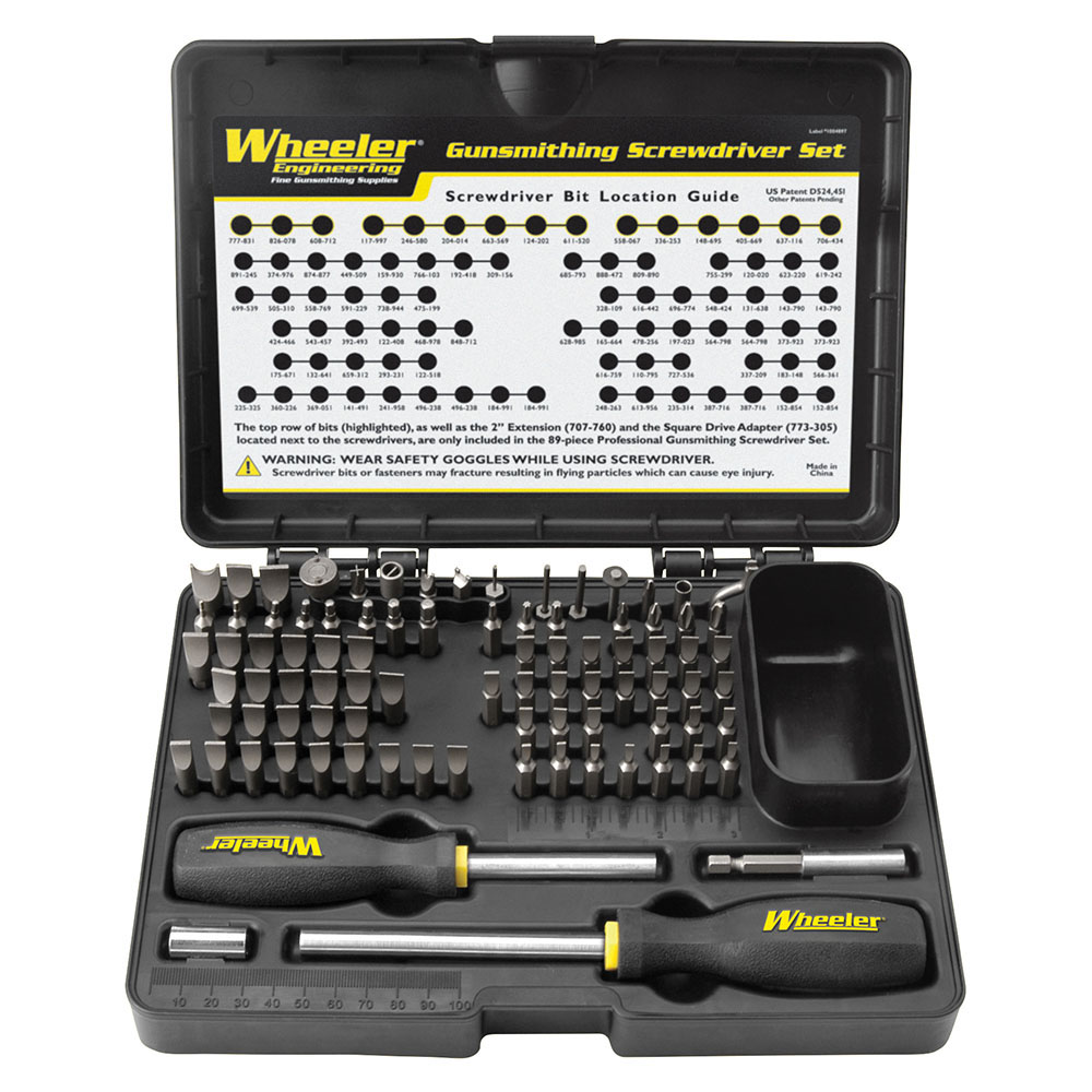 661120621942 Screwdrivers are the most important and most used gunsmithing tools. Wheeler’s Deluxe Gunsmithing Screwdriver Sets belong on every gunsmithing bench. The well thought-out bit selection will put an end to burred, buggered and busted up screw slots on any gun. Unlike other screwdriver suppliers, Wheeler’s engineers measured the screws on over one hundred modern and antique firearms to make sure that we offered bits for every situation. Whether you are working on a Browning® Superposed, a Remington® 700, a Smith & Wesson® revolver or a Colt® single action, you will find that there is a bit to fit every screw on your gun. The 89 piece set includes 15 ingenious “specialty bits”. These bits are great for installing scope bases, getting you out of a pinch by providing a small pin punch when you really need it and keeping once-in-a-while lifesaver tools at your fingertips.Discontinued by manufacturer