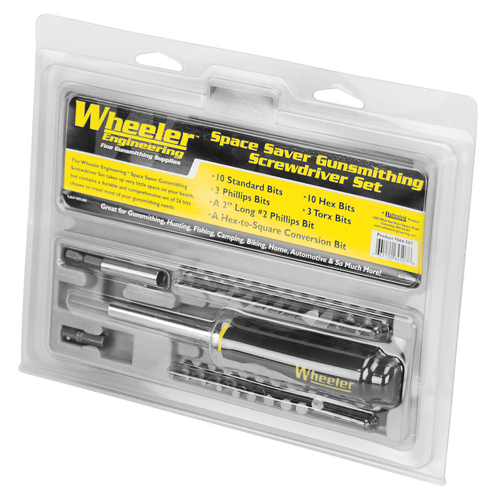 661120645078 Less than half the size of comparable gunsmithing screwdriver sets, the Wheeler® Space Saver Gunsmithing Screwdriver Set takes up very little space on your bench, but contains a durable and comprehensive set of 26 bits chosen to meet most of your gunsmithing needs. It’s also the perfect size to include on your trips to the range and the field. Included with the standard, Phillips, hex, and torx bits, is a 2″ long #2 Phillips bit which is ideal for recoil pad installation, and a hex-to-square conversion bit which allows you to use 1/4″ square drive sockets and other attachments. The magnetic handle is perfectly sized for gunsmithing needs, allowing you to carry a variety of bits if the need should arise.Discontinued by manufacturer